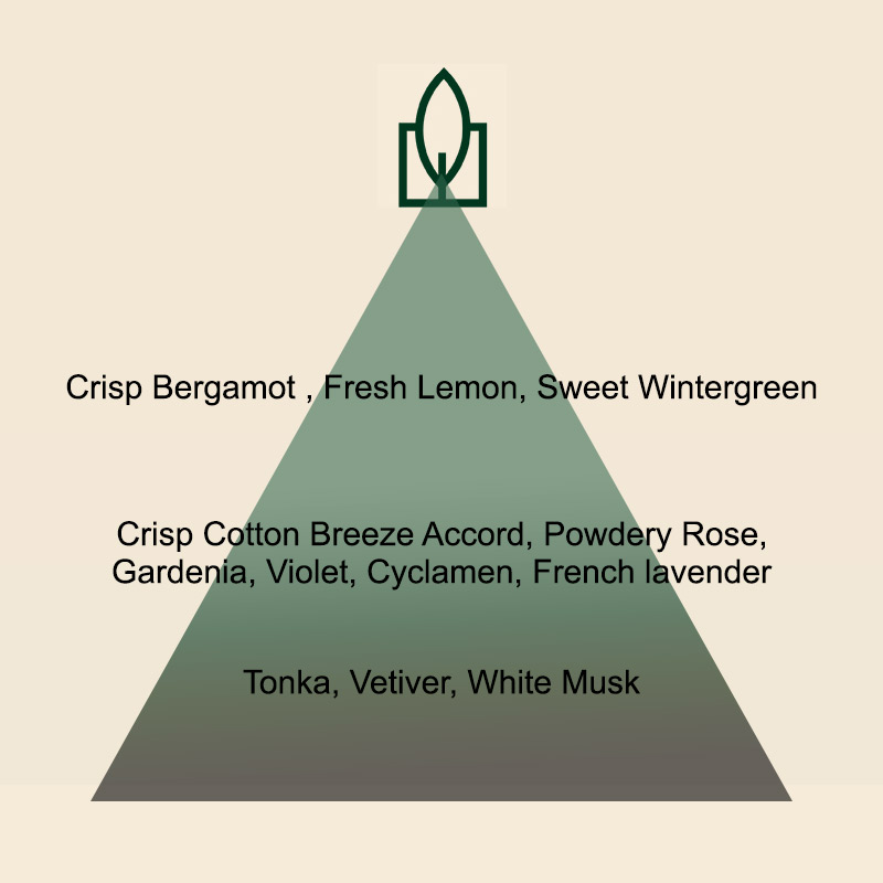 Čist, osvježavajuć i elegantan – Fresh Cotton priziva miris svježe opranog rublja sušenog na suncu, s nježnim citrusnim i biljnim notama koje prostoru daju osjećaj urednosti i lakoće. Savršen za sve koji vole svježinu i diskretnu profinjenost.